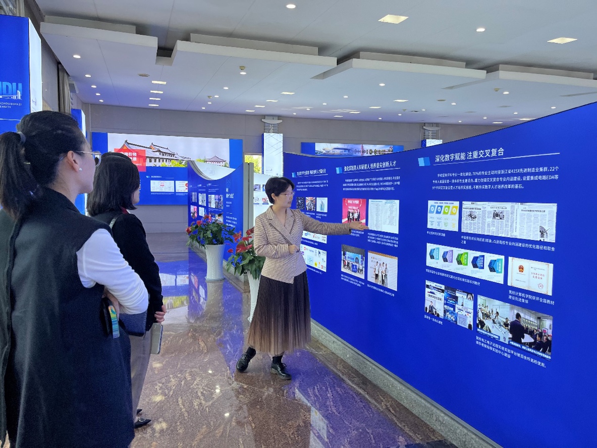 金涛带领华数科技支委会一行参观了杭州电子科技大学“在杭电看见数字科技”成果展,介绍了杭电的办学历史,以及在人才培养、科研和学科建设等成果。金涛表示,希望双方以“党建共创”为平台加强交流,筑造各具特色的共建共创活动品牌,共谋“党建+数字科技”高质量发展。