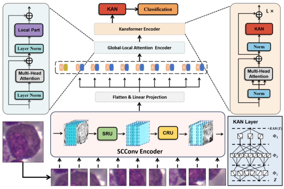 恶性肿瘤(如急性白血病)的发病率和死亡率显著上升。临床上,医院依靠外周血和骨髓涂片的细胞学检查来诊断恶性肿瘤,准确的血细胞计数至关重要。现有的自动化方法在处理高维显微图像数据时面临特征表达能力低、可解释性差以及特征提取冗余等问题。论文提出了一种用于骨髓血细胞的新型细粒度分类模型SCKansformer,该模型解决了上述问题,并提高了分类的准确性和效率。该模型集成了Kansformer 编码器、SCConv 编码器和全局-局部注意力编码器:Kansformer编码器用KAN替代传统的MLP层,提高了非线性特征表示能力和可解释性;SCConv编码器通过空间和通道重建单元增强了特征表示并减少了冗余;全局-局部注意力编码器结合了多头自注意力机制和局部部分模块,以捕获全局和局部特征。