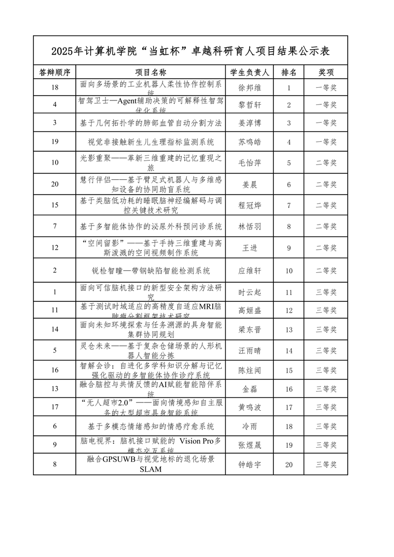 本次“当虹杯”卓越科研育人专项申报最终共收到43份申报书作品。根据专家评委文本盲审结果,共有20个项目进入复审答辩。在复审答辩阶段,根据学生答辩及评审打分,共评出一等奖4项,二等奖6项,三等奖10项,具体名单如下: